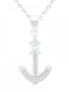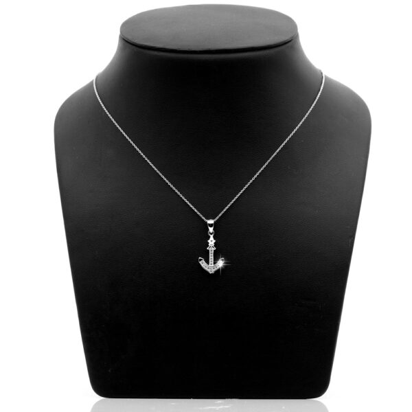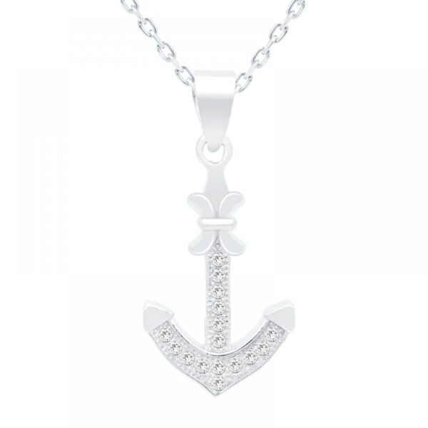 Zawieszka w kształcie kotwicy wykonana ze srebra uszlachetnionego rodem próby 925. Zawieszka ozdobiona białą cyrkonią. Wysokość zawieszki: 30 mm. Szerokość zawieszki: 14 mm. Bez łańcuszka.