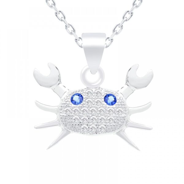 Zawieszka w kształcie kraba wykonana ze srebra uszlachetnionego rodem próby 925. Zawieszka ozdobiona białą cyrkonią. Wysokość zawieszki: 10 mm. Szerokość zawieszki: 17 mm. Bez łańcuszka.