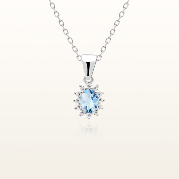 Zawieszka srebrna ozdobiona niebieskim topazem w eleganckiej oprawie wykonana z najwyższej próby srebra 925 – bez niklu, nie uczula. Biżuteria dodatkowo pokryta 3 warstwami szlachetnego rodu. Długość zawieszki: 18mm. Zawieszka ozdobiona naturalnym niebieskim topazem o szlifie owalnym o wielkości 5x7mm oraz cyrkoniami.