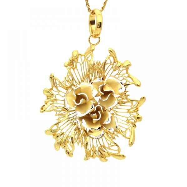 Zawieszka wykonana ze srebra próby 925. Zawieszka dodatkowo pokryta 5 mikronami złota. Wielkość zawieszki 50×35 mm. Biżuteria artystyczna, wykonana ręcznie z największą precyzją i dbałością o szczegóły.