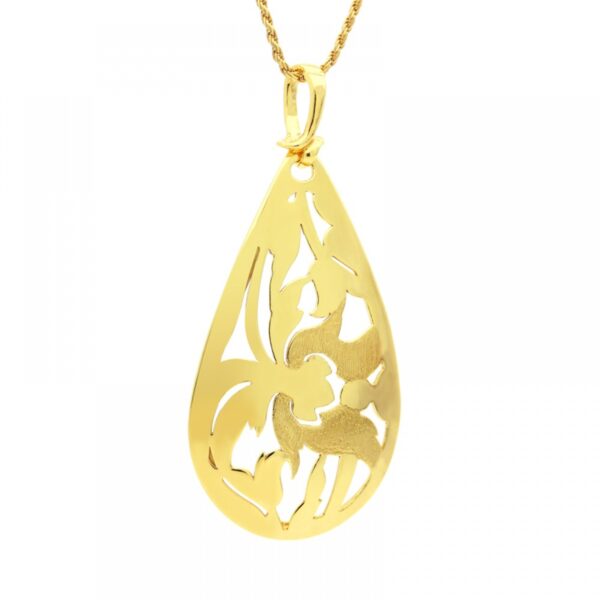 Zawieszka wykonana ze srebra próby 925. Zawieszka dodatkowo pokryta 5 mikronami złota. Wielkość zawieszki 50×25 mm. Biżuteria artystyczna, wykonana ręcznie z największą precyzją i dbałością o szczegóły.