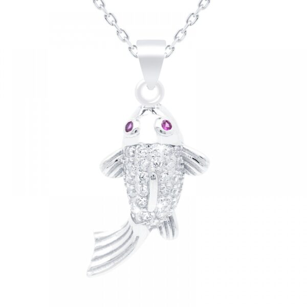 Zawieszka w kształcie rybki wykonana ze srebra uszlachetnionego rodem próby 925. Zawieszka ozdobiona białą cyrkonią. Wysokość zawieszki: 21 mm. Szerokość zawieszki: 11 mm. Bez łańcuszka.