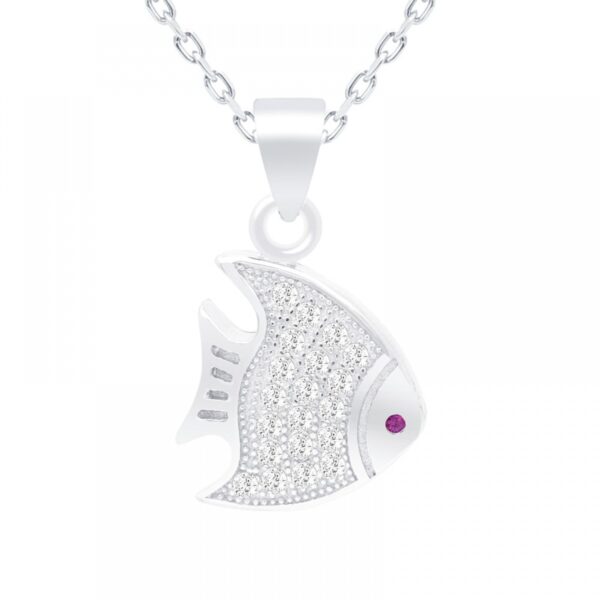 Zawieszka w kształcie rybki wykonana ze srebra uszlachetnionego rodem próby 925. Zawieszka ozdobiona białą cyrkonią. Wysokość zawieszki: 14 mm. Szerokość zawieszki: 11 mm. Bez łańcuszka.