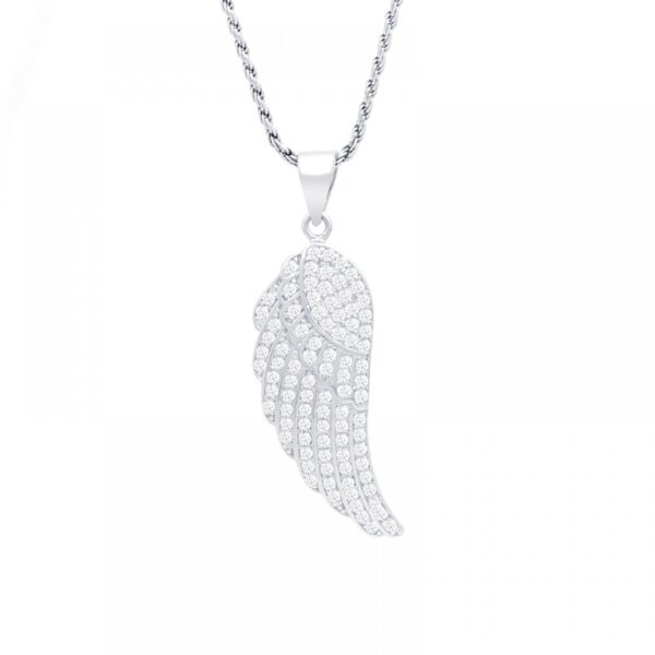 Zawieszka w kształcie skrzydła wykonana ze srebra próby 925 oraz ozdobiona cyrkoniami o brylantowym szlifie. Srebro uszlachetnione rodem. Wysokość zawieszki 3 cm. Zawieszka sprzedawana bez łańcuszka.