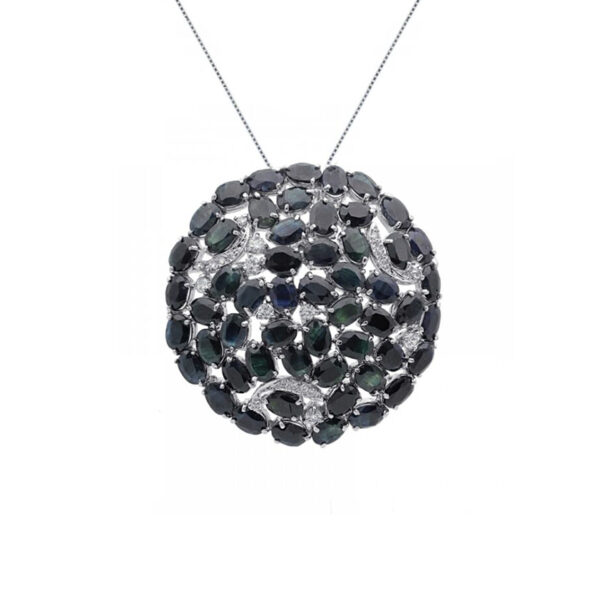 Unikatowa duża zawieszka z szafirami przepięknie ozdobi dekolt podkreślając wyrazistość, elegancję oraz kobiecość Twojej kreacji. Ta niepowtarzalna precioza będzie idealnym uzupełnieniem Twojej kolekcji biżuterii. Zawieszka będzie przepięknie prezentowała się noszona samodzielnie, jak i w komplecie z pierścionkiem oraz kolczykami z naturalnymi szafirami.