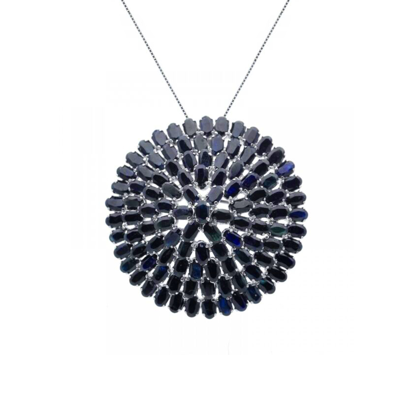 Unikatowa duża zawieszka z szafirami przepięknie ozdobi dekolt podkreślając wyrazistość, elegancję oraz kobiecość Twojej kreacji. Ta niepowtarzalna precioza będzie idealnym uzupełnieniem Twojej kolekcji biżuterii. Zawieszka będzie przepięknie prezentowała się noszona samodzielnie, jak i w komplecie z pierścionkiem oraz kolczykami z naturalnymi szafirami.