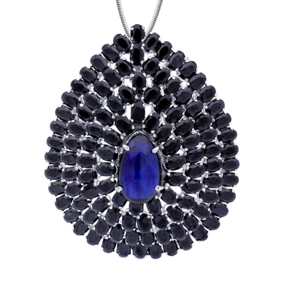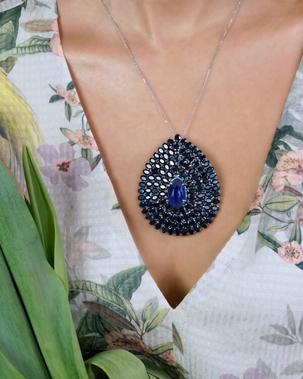 Zawieszka z szafirem srebrna okazała. Zawieszka-broszka wykonana z najwyższej próby srebra 925 – bez niklu, nie uczula. Zawieszka dodatkowo pokryta 3 warstwami szlachetnego rodu. Wymiary zawieszki: 68×57 mm. Wielkość centralnego kamienia: 21×12 mm. Wielkość mniejszych kamieni: 6×4 mm. Zawieszkę można nosić również jako broszkę. Unikatowa szlachetna ozdoba z najwyższej jakości szafirami została wykonana z ogromną precyzją przez mistrzów sztuki jubilerskiej.