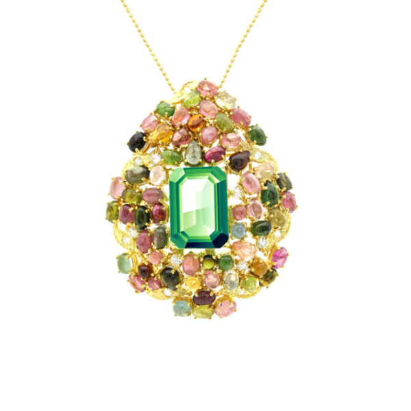 Centralny kamień – Duży Naturalny Birmański Zielony Topaz najwyższej klasy AAA o rzadko spotykanym Szlifie: Szmaragdowym. Szlif nadany ręcznie w najlepszej manufakturze szlifierskiej kamieni naturalnych na świecie w Jaipur w Indiach. Szlif wykonany przez profesjonalnych szlifierzy specjalizujących się w kunszcie szlifierstwa jubilerskiego. Kamień wydobyty w Birmie, regionie o unikalnych złożach topazów na świecie. Birmańskie Topazy charakteryzują się najwyższą na świecie jakością oraz przejrzystością. Są cenione przez najbardziej prestiżowe domy mody takie jak: Cartier, Tiffany, Bvlgari. Sięgają po nie uznani projektanci światowego jubilerstwa przy tworzeniu unikalnych kolekcji. Zielony Topaz o najwyższej klasie kamienia AAA, najwyższej jakości oraz o najwyższym stopniu przeźroczystości. Jakość kamienia jest porównywalna z klasą diamentu o czystości VVS.