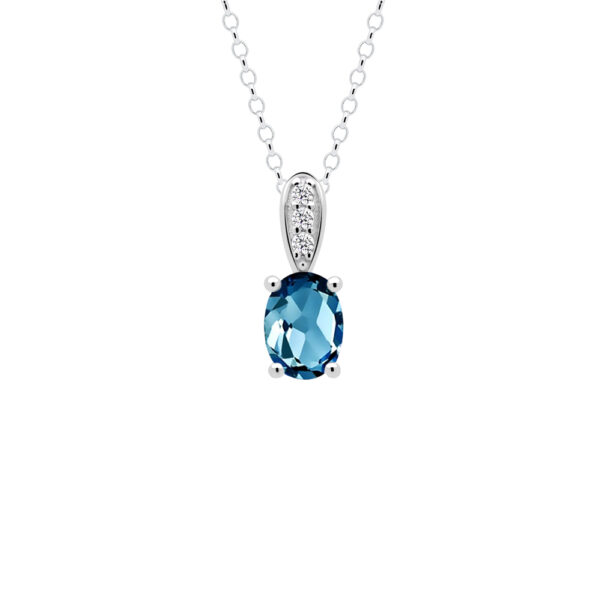 Zawieszka z topazem london blue srebrna z cyrkoniami. Biżuteria wykonana z najwyższej próby srebra 925 – bez niklu, nie uczula. Zawieszka dodatkowo pokryta 3 warstwami szlachetnego rodu. Wielkość kamienia: 6×8 mm. Zawieszka o długości: 15 mm ozdobiona naturalnym szlachetnym topazem london blue o szlifie owalnym oraz cyrkoniami o szlifie brylantowym. Przejrzystość cyrkoni: klasa pierwsza AAAAA+. Wysokiej klasy cyrkonie nadają delikatny błyszczący efekt. Wyrób jubilerski wysokiej jakości wykonany przez mistrzów jubilerstwa z ogromną precyzją oraz dbałością o detale.