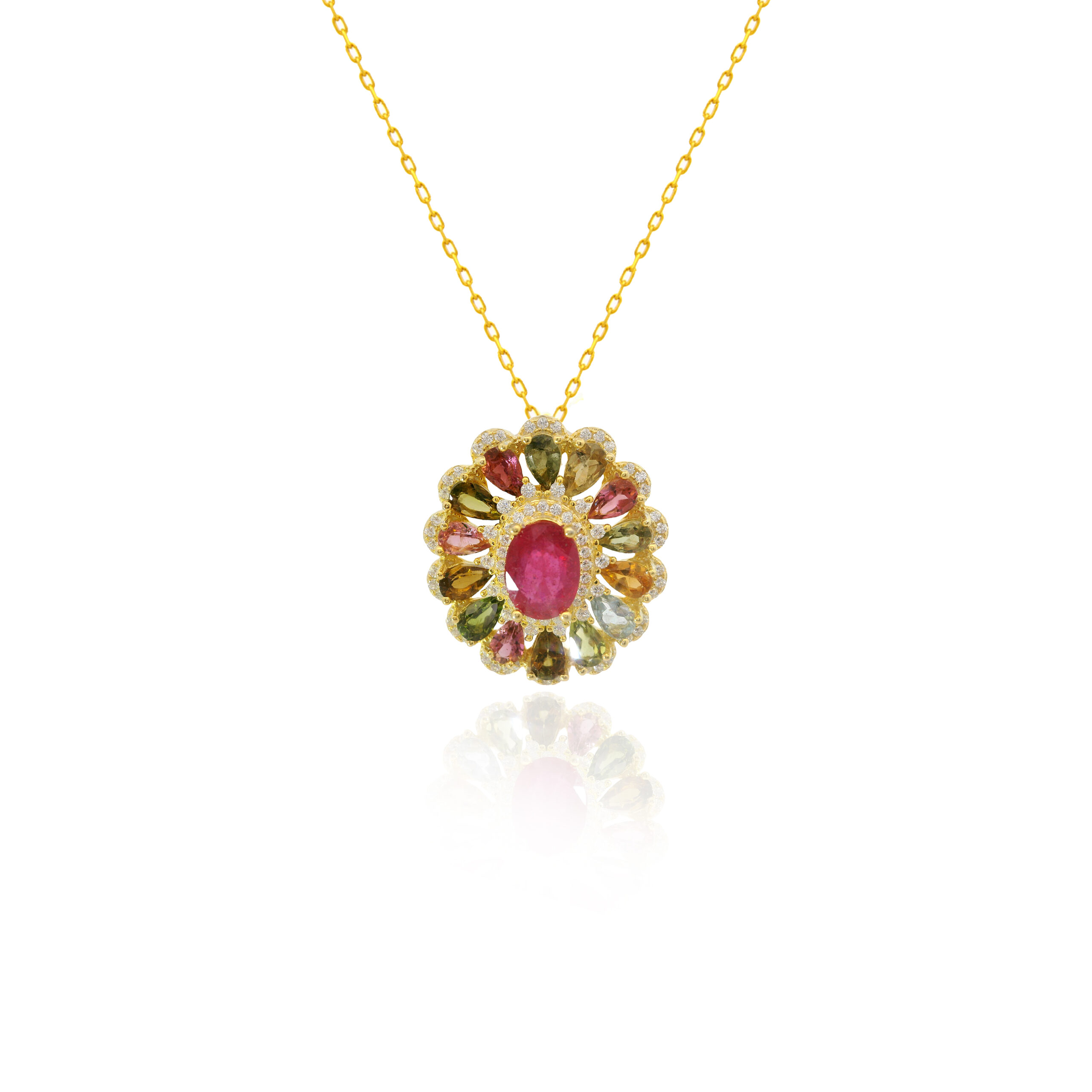 Zawieszka z turmalinami i rubinem srebro pozłacane wykonana z najwyższej próby srebra 925 – bez dodatku niklu, nie uczulają. Zawieszka pokryta 3 warstwami 24 karatowego złota. Wielkość zawieszki: 23×25 mm. Wyrób jubilerski wykonany z ogromną precyzją przez mistrzów jubilerstwa.