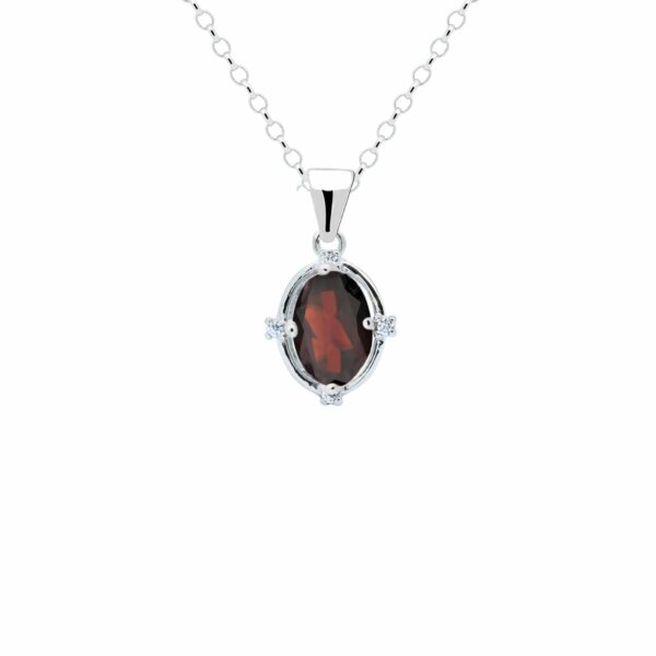 Centralnym punktem zawieszki jest owalny granat o nasyconej, bordowo-burgundowej barwie, osadzony w czterech podwójnych łapkach, które stabilnie utrzymują kamień i eksponują jego fasetowy szlif. Delikatne, bezbarwne akcenty umieszczone po dwóch stronach głównego kamienia – prawdopodobnie cyrkonie – dodają całości lekkości i świetlistego wykończenia. Ich misterny blask subtelnie kontrastuje z ciemną czerwienią granatu, tworząc klasyczną, wytworną kompozycję. Całości dopełnia eleganckie uszko o trapezowym kształcie, zapewniające idealne ułożenie na łańcuszku i wygodne noszenie.