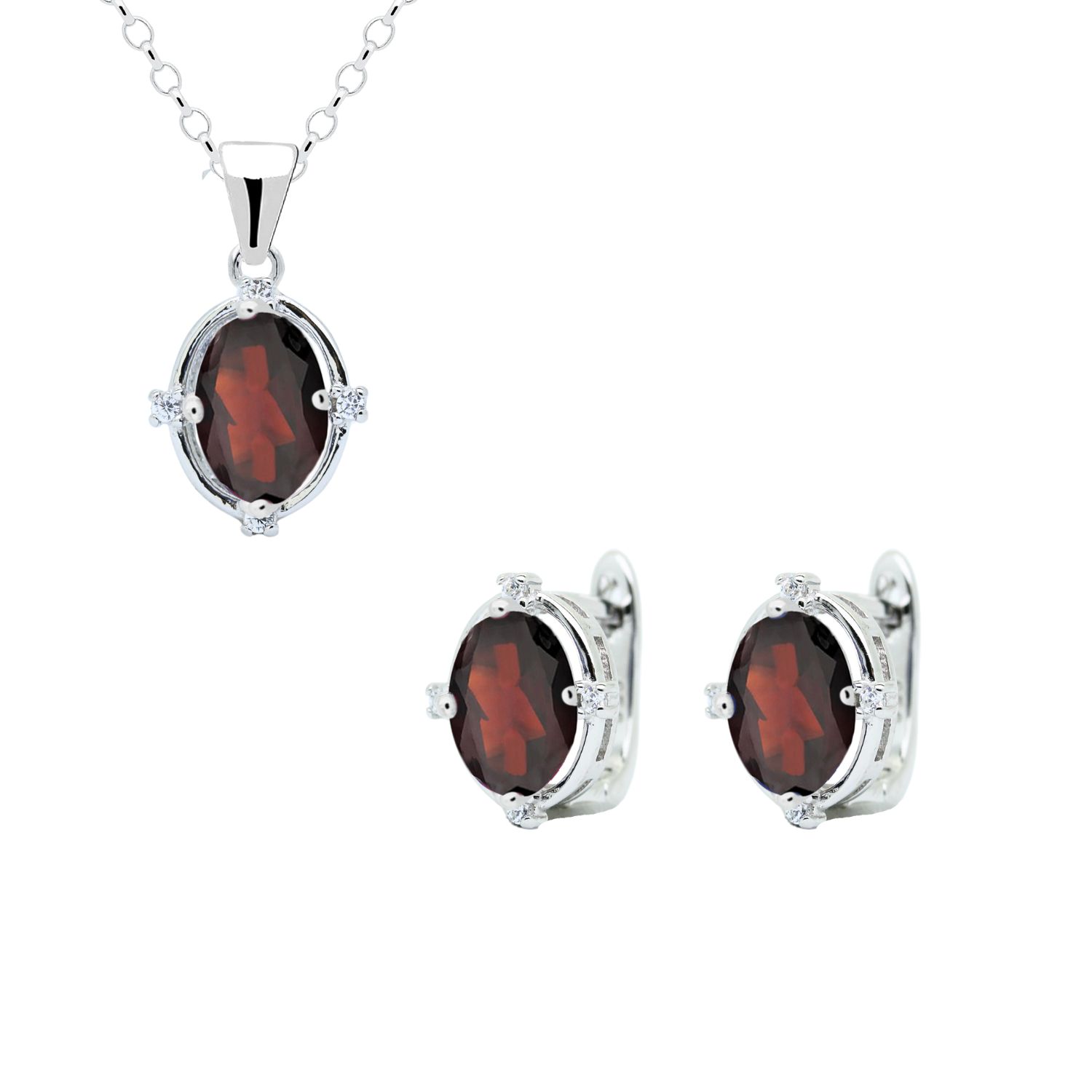 Elegancki komplet srebrny z granatem obejmuje zawieszkę bez łańcuszka oraz kolczyki z wygodnym zapięciem angielskim. Ozdobiony owalnymi granatami w otoczeniu drobnych, bezbarwnych kamieni zachwyca klasycznym wzornictwem i wysokim połyskiem. Wykonano go ze srebra 925, pokrytego rodem, co zapewnia trwałość, hipoalergiczność i luksusowy wygląd.
