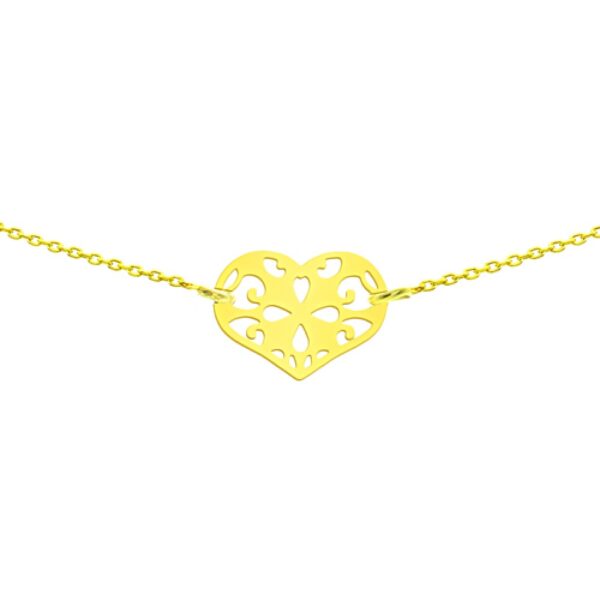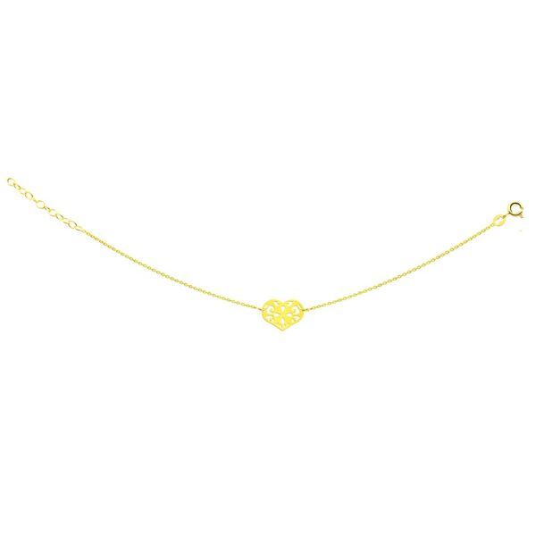 Bransoletka z zawieszką w kształcie ażurowego serduszka wykonana ze złota próby 585. Długość bransoletki: 17-20 cm. Szerokość zawieszki 1 cm.