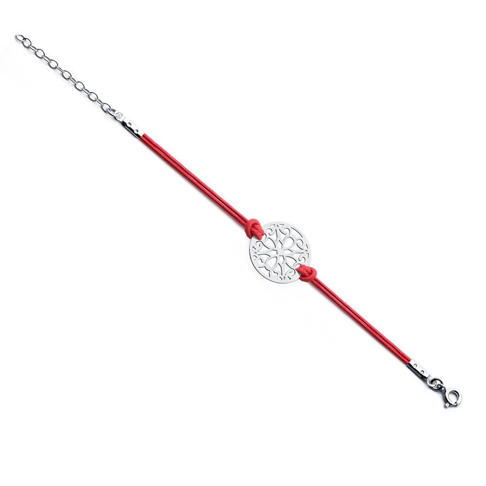 Bransoletka na sznurku czerwonym srebrna ażurowe kółko