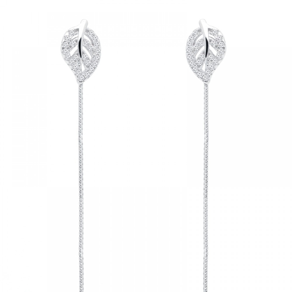 Kolczyki przekładane przez ucho z łańcuszkiem, ozdobione cyrkoniami oraz wykonane ze srebra uszlachetnionego rodem próby 925. Wielkość części ozdobnej 12×8 mm. Długość łańcuszka: 8 cm.