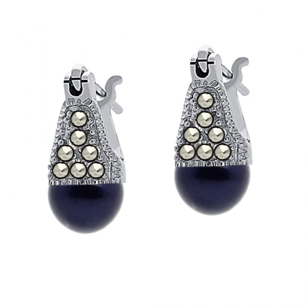Kolczyki z granatową masą perłową i markazytami wykonane ze srebra próby 925. Wielkość 15 mmx7mm.
