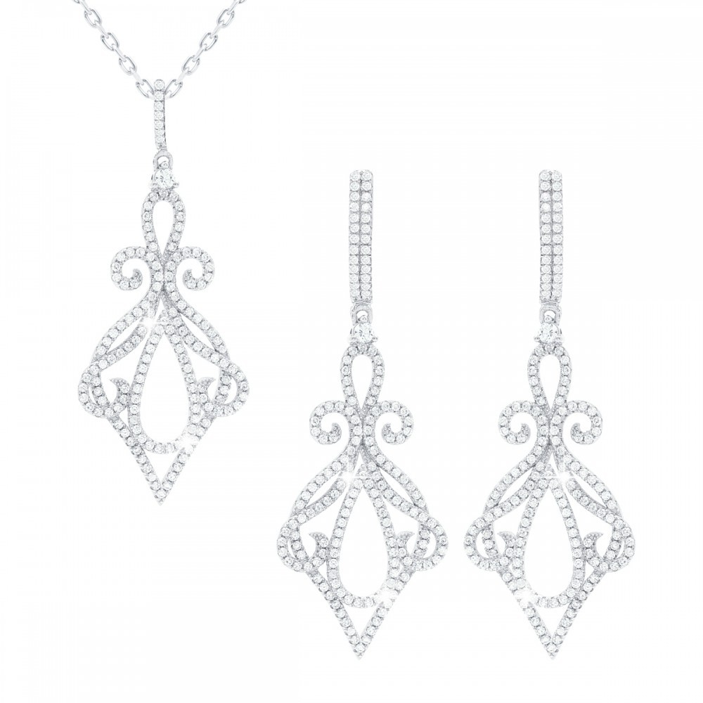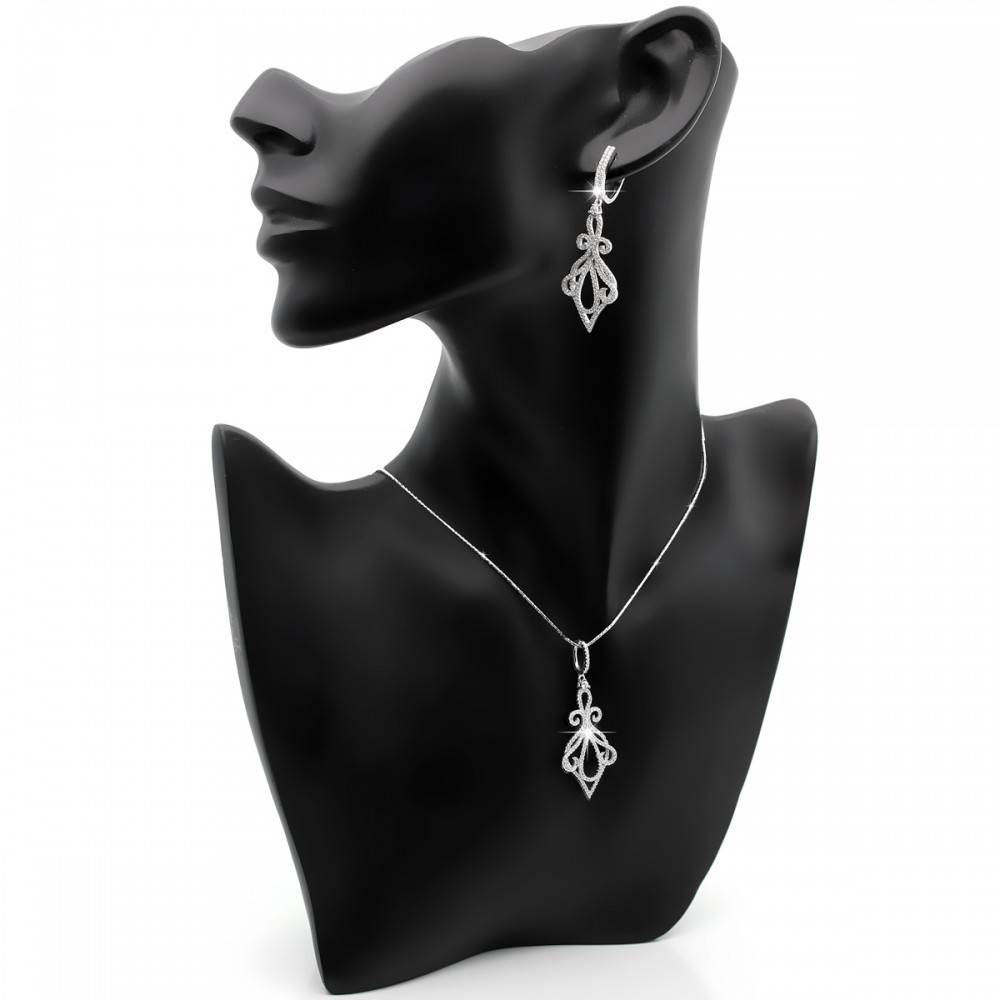 Komplet srebrny ślubny z białą cyrkonią – kolczyki wiszące z zawieszką wykonany z najwyższej próby srebra 925 – bez dodatku niklu, nie uczula. Biżuteria dodatkowo pokryta 3 warstwami szlachetnego rodu. Komplet zdobiony białą cyrkonią o brylantowym szlifie. Kolczyki zapinane na zapięcie angielskie. Długość zawieszki: 50mm. Wysokość kolczyków: 52mm.