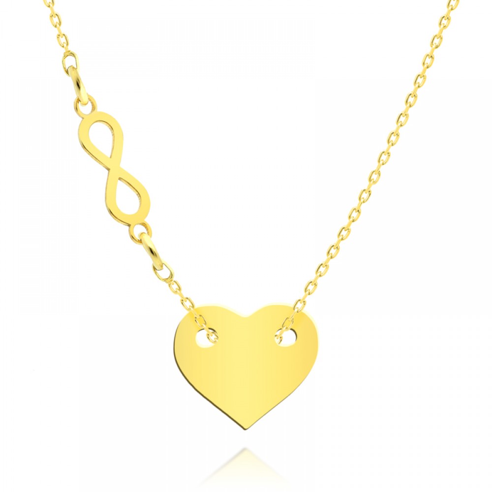 Naszyjnik celebrytka srebrna pozłacana serce ze znakiem nieskończoności. Celebrytka z zawieszką sercem oraz Infinity – znak nieskończoności wykonana z najwyższej próby srebra 925 – bez dodatku niklu, nie uczula. Biżuteria modowa pokryta 3 warstwami 24 karatowego złota. Wielkość zawieszki serca 12×12 mm, zawieszki Infinity 12×5 mm. Zawieszki o strukturze gładkiej, polerowanej i błyszczącej, zawieszone na łańcuszku o splocie ankier. Splot ankier jest jednym z najmocniejszych splotów, odpornym na zerwania. Długość naszyjnika jest regulowana i wynosi od 42 do 44 cm.