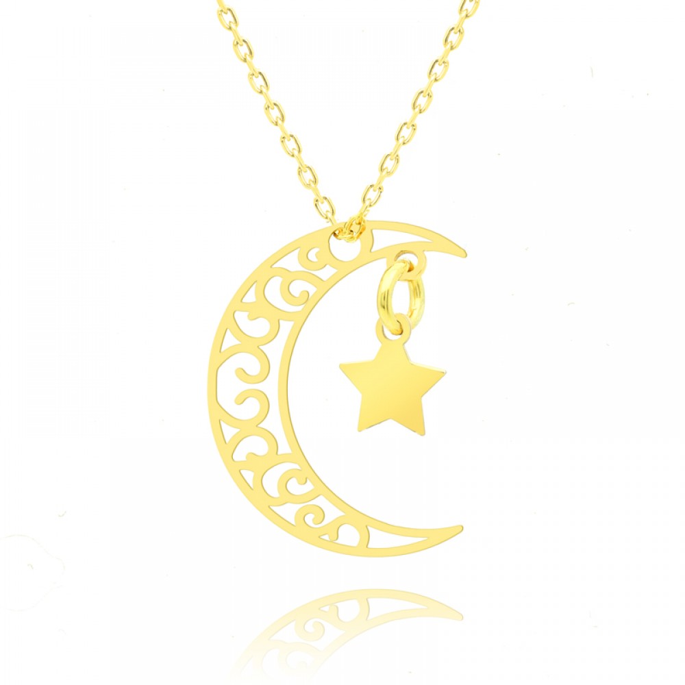 Naszyjnik z zawieszką w kształcie ażurowego księżyca. Naszyjnik wykonany ze srebra próby 925 oraz pokryty warstwą 24 karatowego złota. Wielkość zawieszki: 20×17 mm. Wielkość gwiazdki: 4×4 mm Długość naszyjnika regulowana: 42-45 cm.