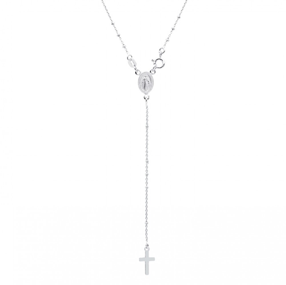 Różaniec- naszyjnik z religijnym akcentem, wykonany ze srebra próby 925 oraz uszlachetniony rodem. Długość naszyjnika 46 cm. Wielkość medalika 1 cm. Wielkość krzyżyka 1,5 cm. Długość naszyjnika od medalika do krzyżyka 7 cm. Różaniec stanowi idealne dopełnienie Twojej kolekcji biżuterii. Naszyjnik ten podkreśli Twoją stylizację nadając jej wyjątkowego charakteru.