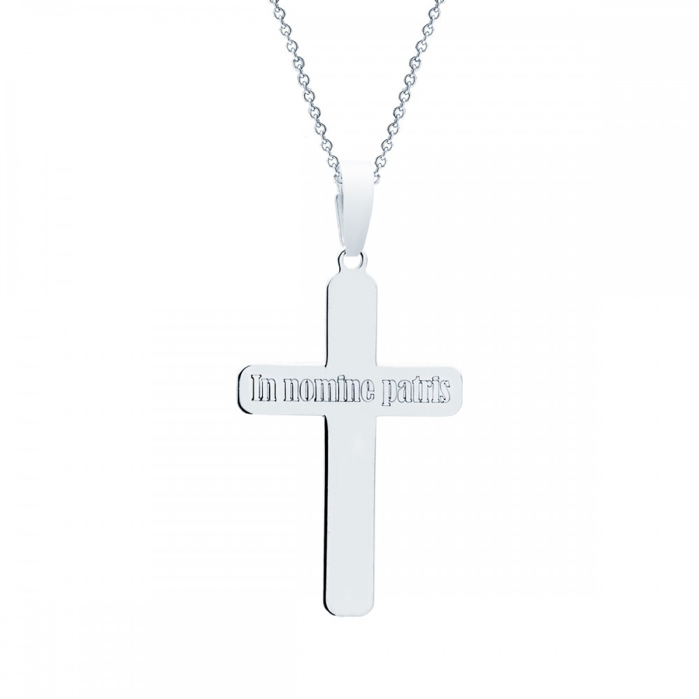 Zawieszka krzyżyk z wygrawerowanym napisem „In nomine patris” (W imię Ojca). Zawieszka wykonana ze srebra próby 925, uszlachetniona warstwą rodu. Wysokość zawieszki 4,5 cm. Bez łańcuszka.